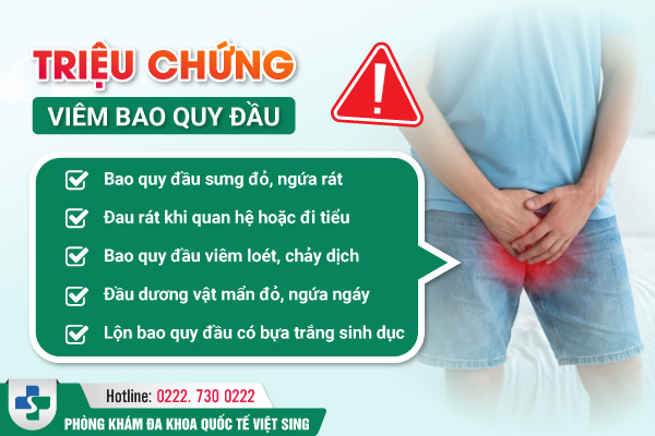 - Viêm bao quy đầu: Do thói quen vệ sinh không sạch sẽ, quan hệ không an toàn hoặc bị dài – hẹp bao quy đầu dẫn đến tích tụ cặn bã lâu ngày gây viêm nhiễm xuất hiện các dấu hiệu mụn nhỏ li ti, gây viêm loét, sưng tấy. Nếu không được chữa trị sớm sẽ gây ra viêm nhiễm tiết niệu, ảnh hưởng chất lượng tinh trùng và nguy cơ lây nhiễm chéo.