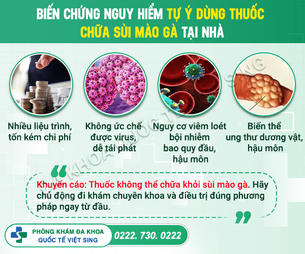 Biến chứng: Sùi mào gà ban đầu mới chỉ là những nốt sùi mọc riêng lẻ nhưng càng về sau chúng càng tăng nhanh kích thước rồi kết hợp lại với nhau tạo thành các đám lớn giống hình dạng mào gà. Sùi mào gà không tự khỏi, nếu không điều trị sẽ lây lan rộng, dễ tái phát, và tăng nguy cơ ung thư (đặc biệt là cổ tử cung ở nữ).