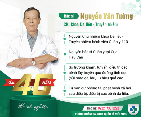 - Bác sĩ CKI Nguyễn Văn Tường – với hơn 30 năm kinh nghiệm khám và điều trị các bệnh lây qua đường tình dục, được nhiều bệnh nhân tin tưởng nhờ tay nghề vững và phương pháp điều trị hiện đại.